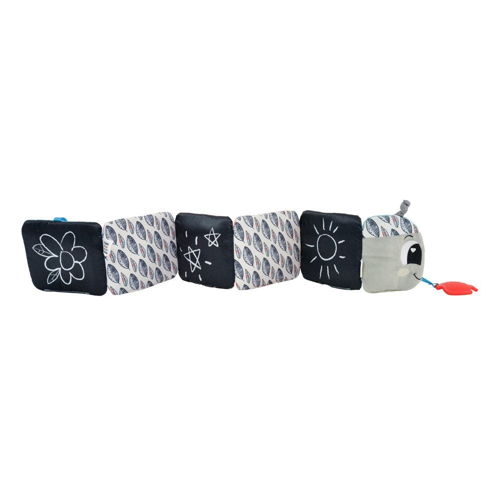 On one side of the Caterpillar, it's bursting with bright colors, playful images, and exciting things to explore - like a hidden squeaker, unique fabric textures, and delightful crinkle sounds.