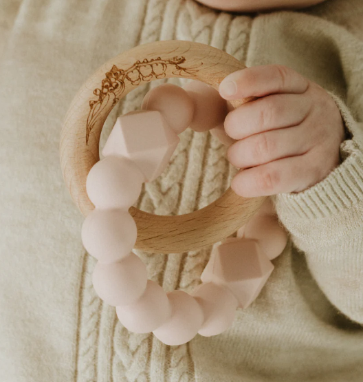 Our Moon Teethers can be washed with warm soapy water or wiped with a damp cloth.