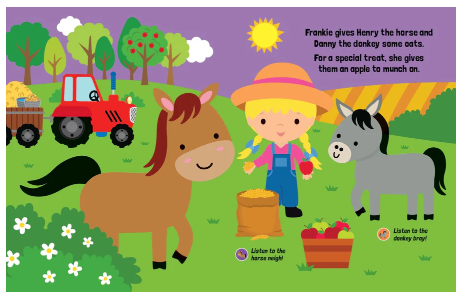 What sounds do all of the farm animals make? This cute story is all about animals found on the farm, alongside 10 animal sounds.