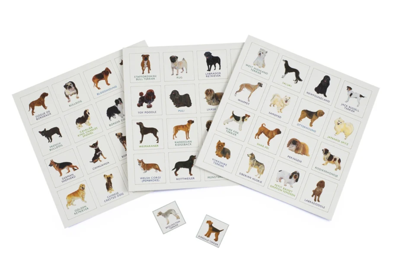 This beautifully illustrated bingo game features 64 breeds of dog from around the world.