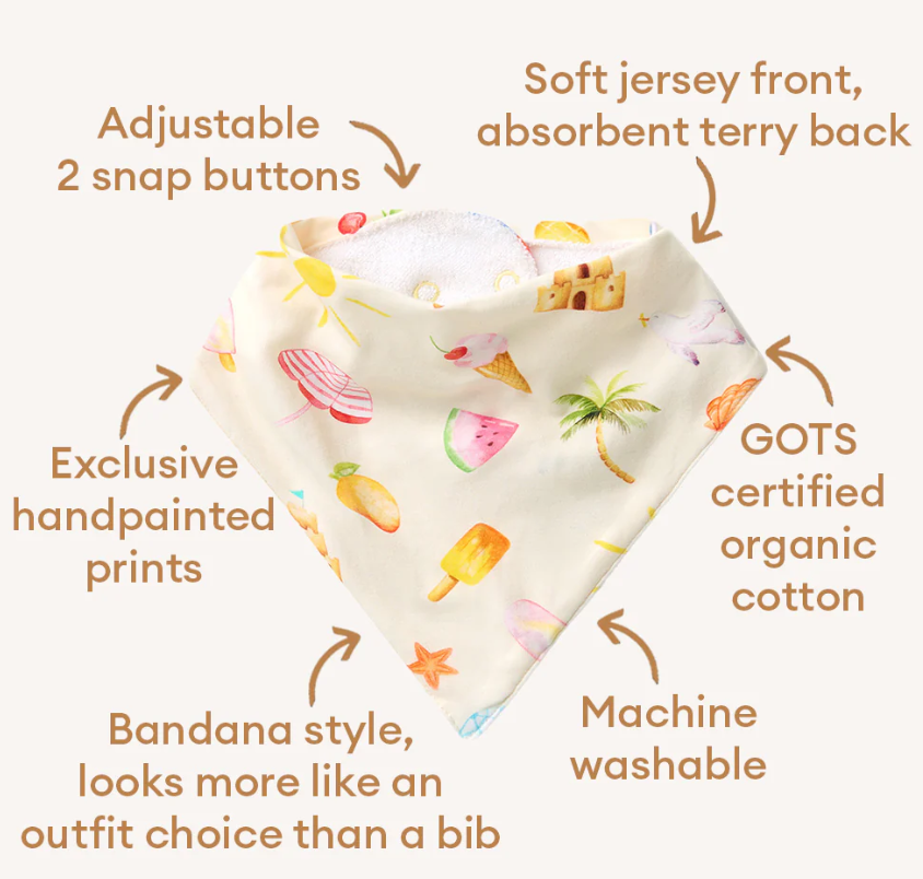 Our bandana dribble bibs feature our exclusive prints on one side and luxurious organic terry cotton on the back. The bibs come with two easy snap buttons to adjust the fit and are machine washable. Our bibs make great gifts too.
