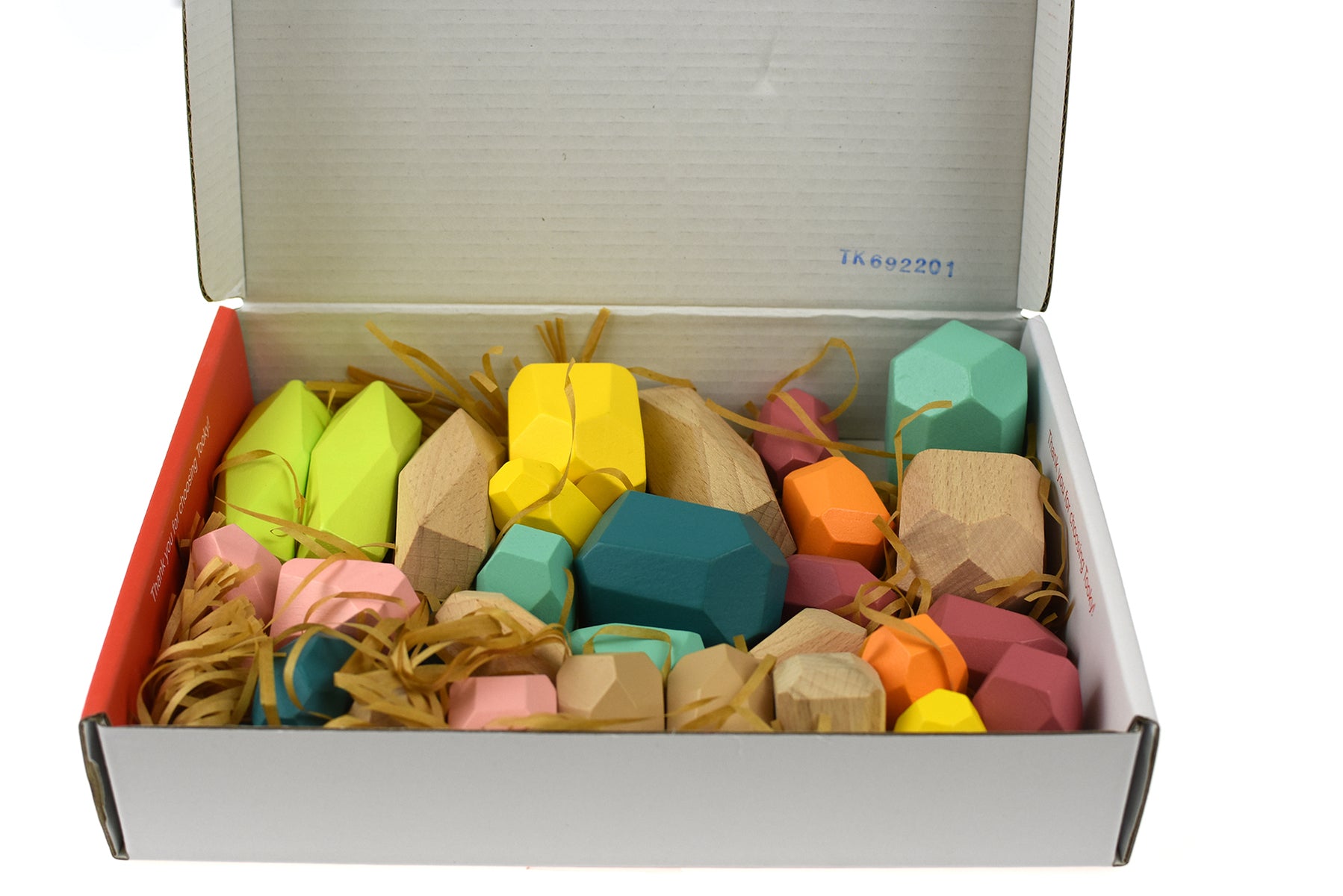 Each set comes in a unique colours combination such as peach, rhubarb red and azure blue. The stones are polyhedrons, with polygonal/ flat-cutting surfaces, multiple sides, straight edges and smooth corners. They are perfect for stacking and pretty inspiring for kids.