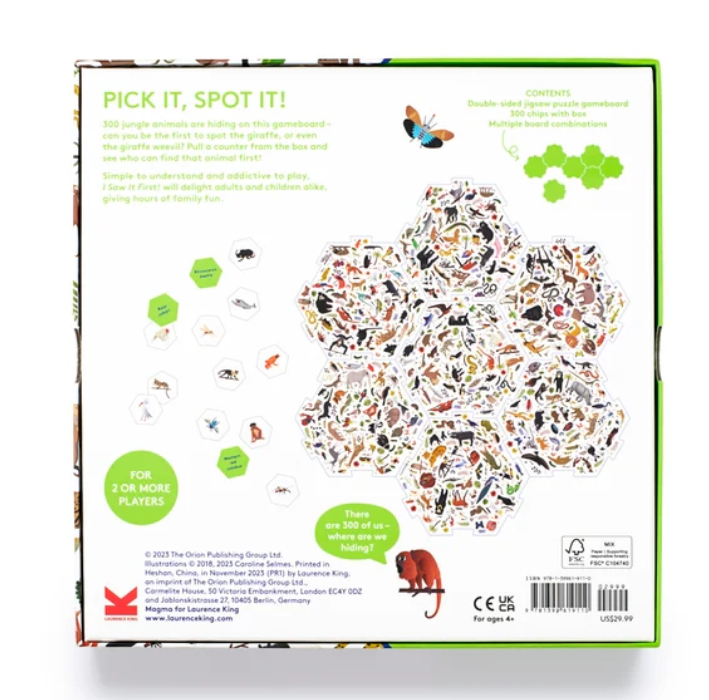 Now in a square box, I Saw it First! Jungle includes a double-sided hexagonal board and 300 counters with charming animal illustrations by Caroline Selmes.
